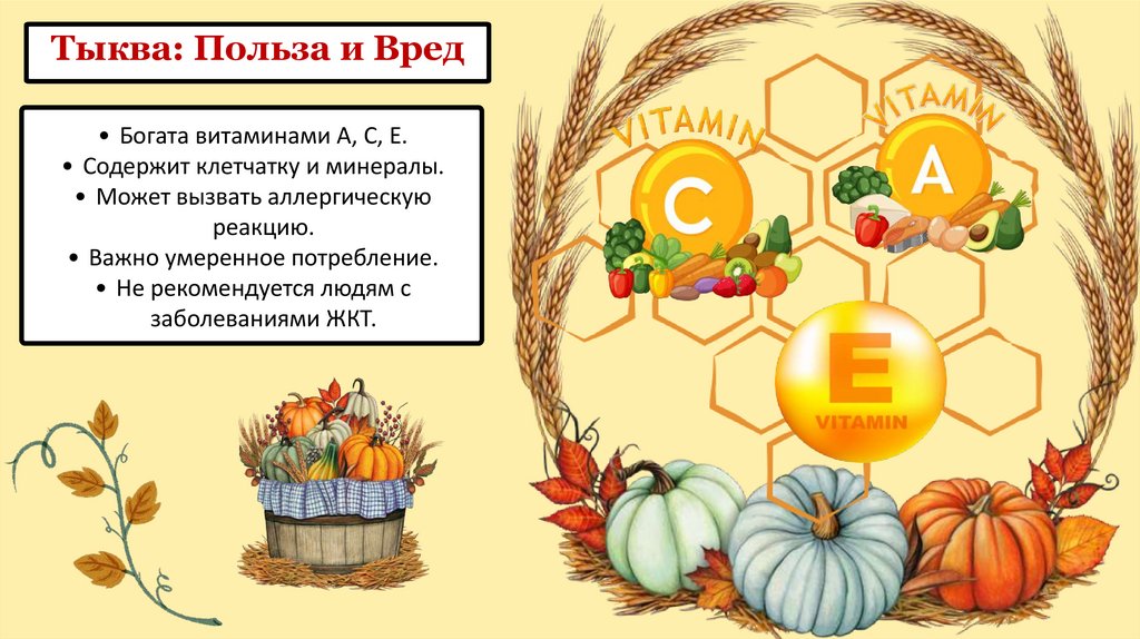 Тыква: Польза и Вред• Богата витаминами А, С, Е.