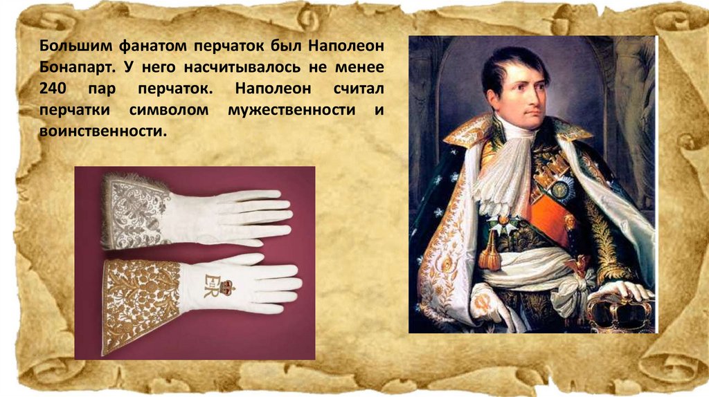 Большим фанатом перчаток был НаполеонБонапарт. У него насчитывалось не менее