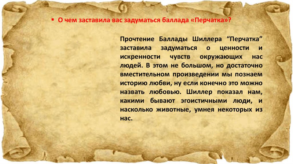 О чем заставила вас задуматься баллада «Перчатка»?Прочтение Баллады Шиллера “Перчатка”