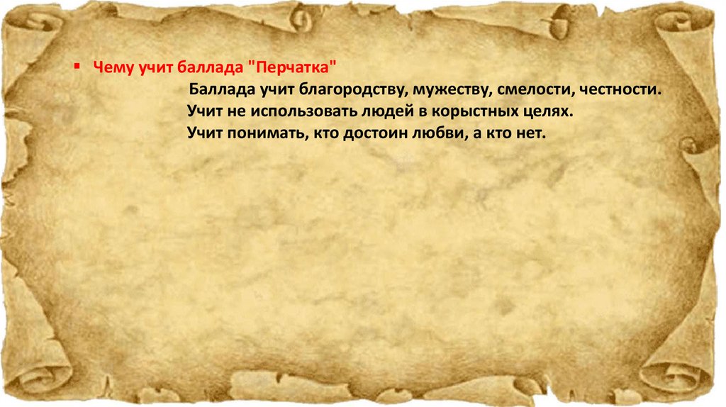Чему учит баллада "Перчатка"Баллада учит благородству, мужеству, смелости, честности.