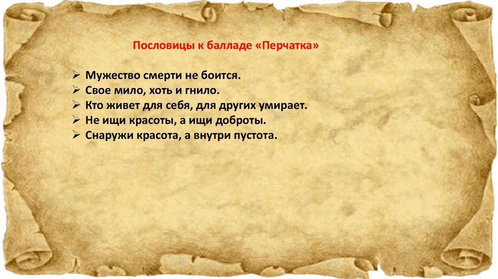 Пословицы к балладе «Перчатка»Мужество смерти не боится.
