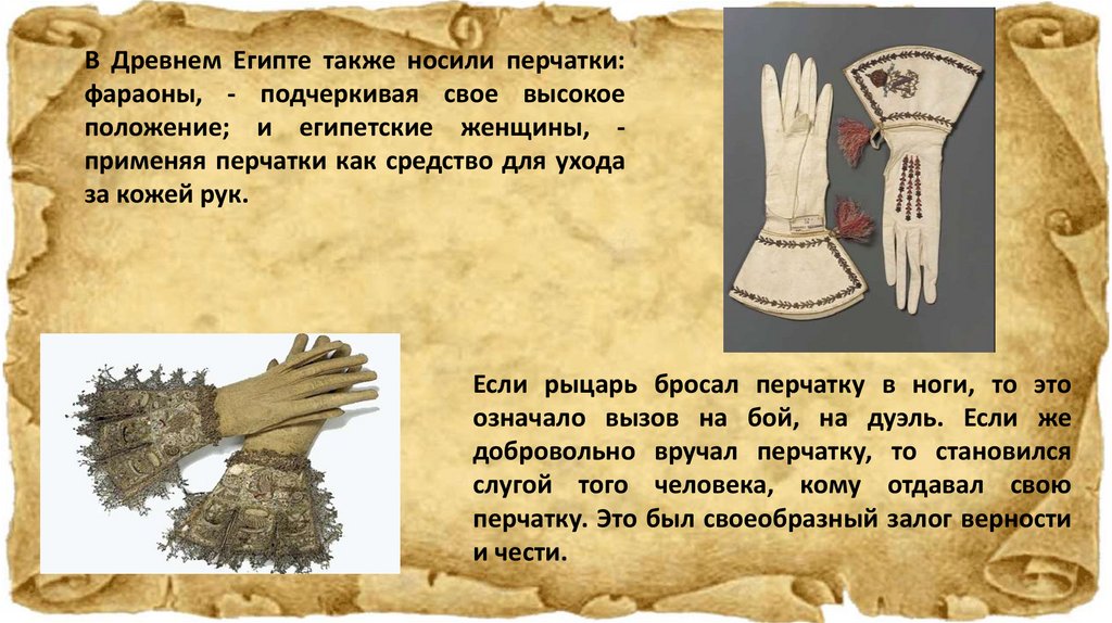 В Древнем Египте также носили перчатки:фараоны, - подчеркивая свое высокое