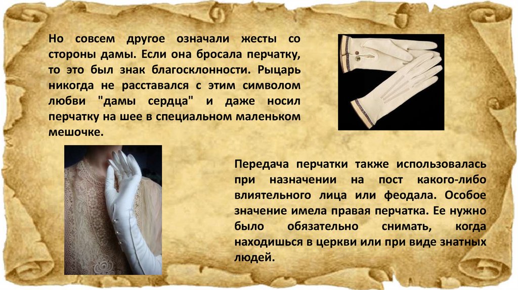 Но совсем другое означали жесты состороны дамы. Если она бросала перчатку,