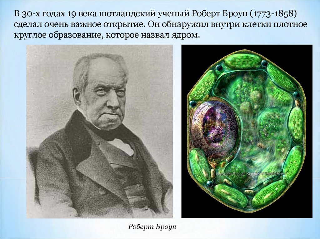В 30-х годах 19 века шотландский ученый Роберт Броун (1773-1858)сделал очень важное открытие. Он обнаружил внутри клетки плотное