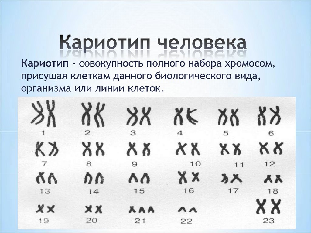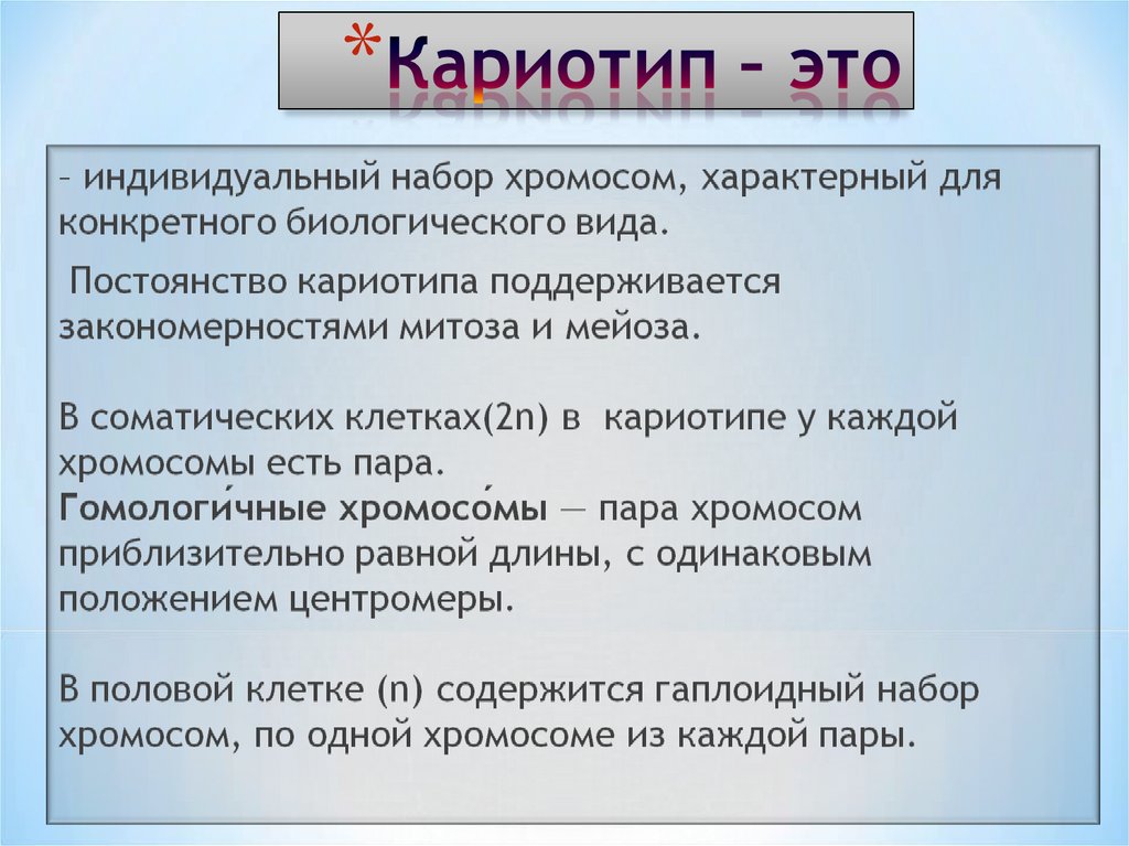 Кариотип - совокупность полного набора хромосом,присущая клеткам данного биологического вида,