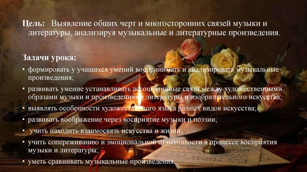 Цель: Выявление общих черт и многосторонних связей музыки илитературы, анализируя музыкальные и литературные произведения.