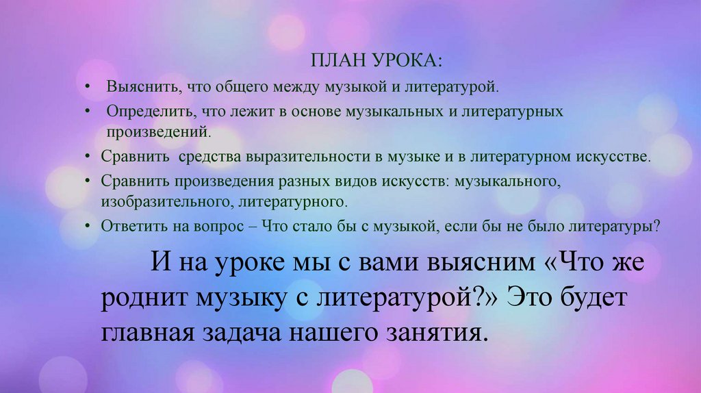 ПЛАН УРОКА:• Выяснить, что общего между музыкой и литературой.