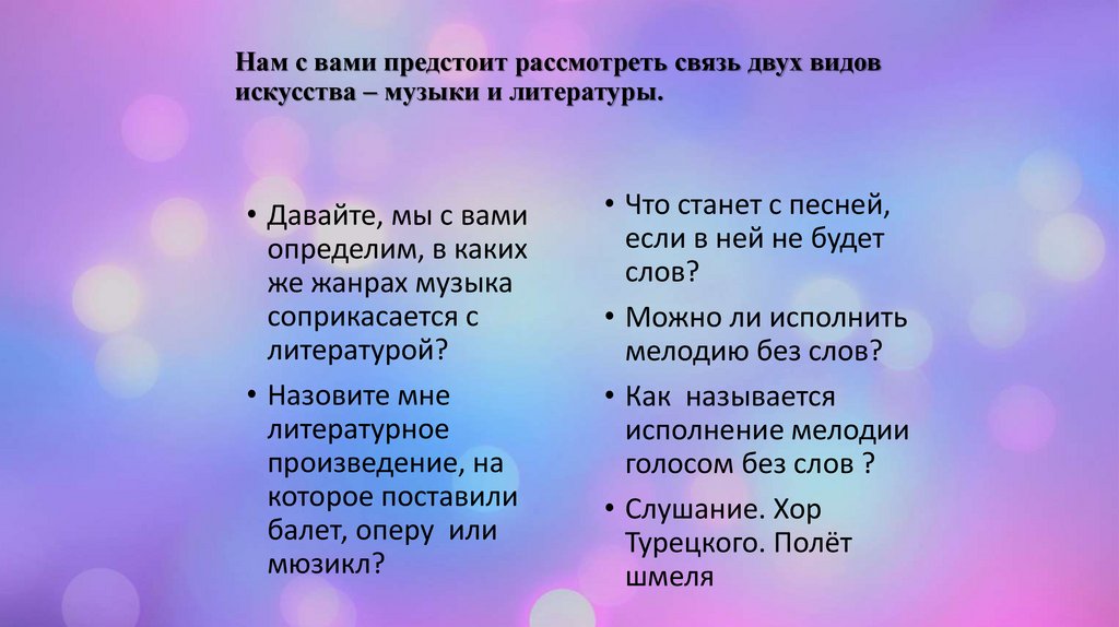 Нам с вами предстоит рассмотреть связь двух видовискусства – музыки и литературы.