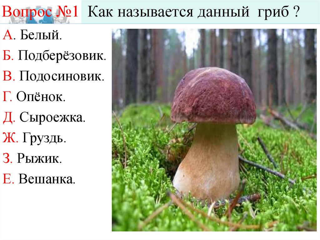 Вопрос №1 Как называется данный гриб ?А. Белый.