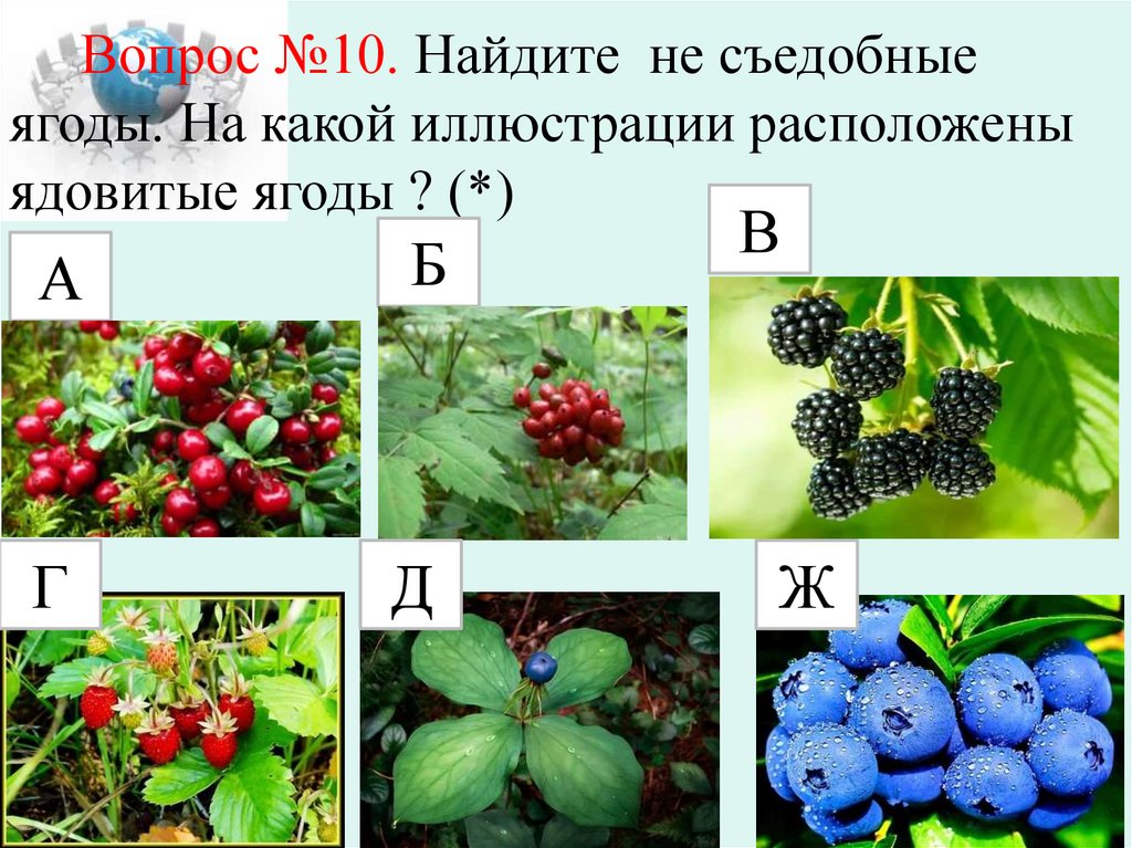 Вопрос №10. Найдите не съедобныеягоды. На какой иллюстрации расположены
