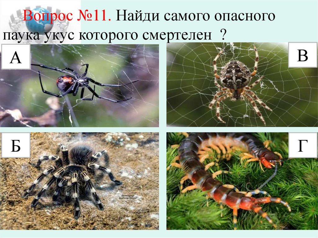 Вопрос №11. Найди самого опасногопаука укус которого смертелен ?