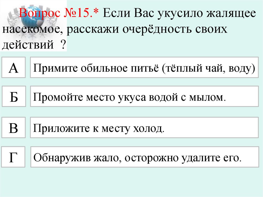 Вопрос №15.* Если Вас укусило жалящеенасекомое, расскажи очерёдность своих