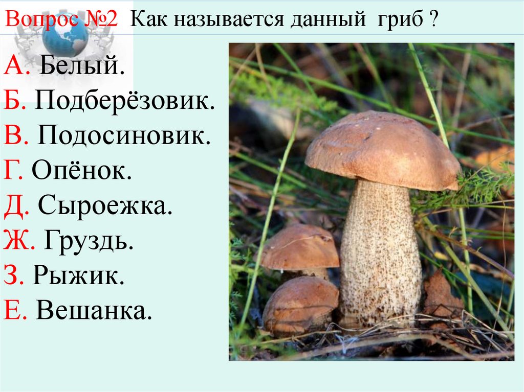 Вопрос №2 Как называется данный гриб ?А. Белый.