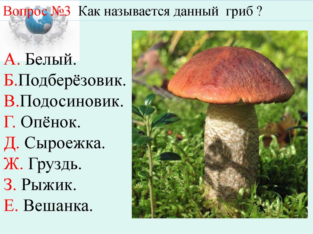 Вопрос №3 Как называется данный гриб ?А. Белый.