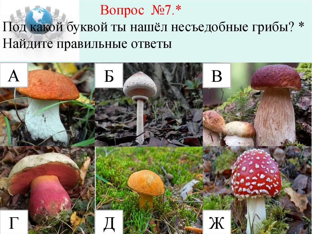 Вопрос №7.*Под какой буквой ты нашёл несъедобные грибы? *