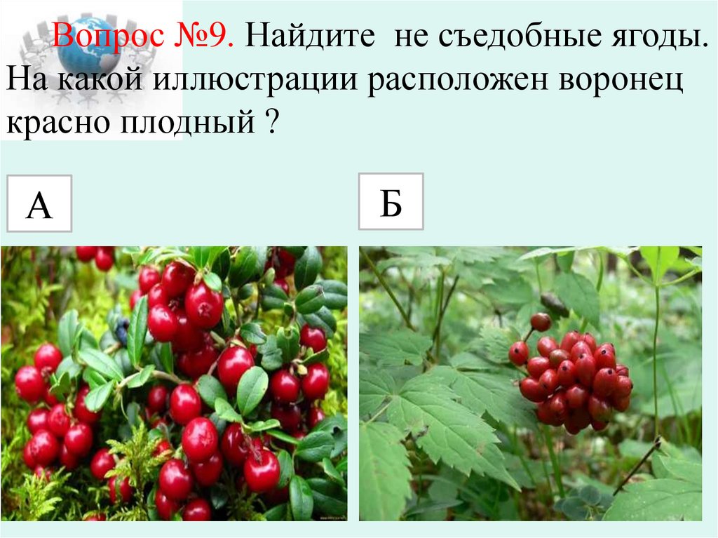 Вопрос №9. Найдите не съедобные ягоды.На какой иллюстрации расположен воронец