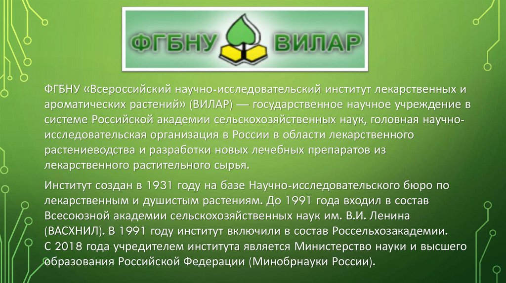 системе Российской академии сельскохозяйственных наук, головная научноисследовательская организация в России в области лекарственного