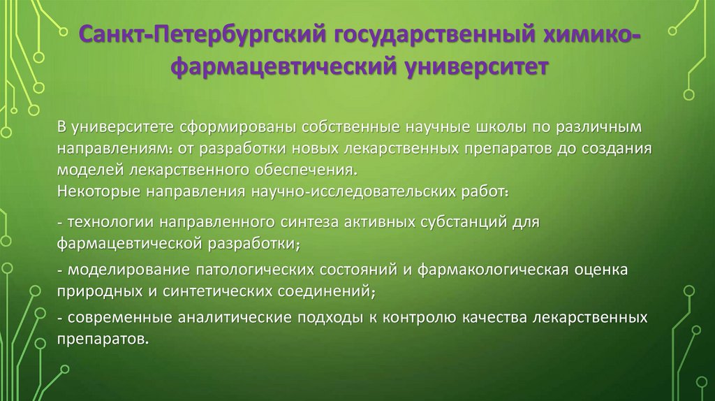 Санкт-Петербургский государственный химикофармацевтический университетВ университете сформированы собственные научные школы по различным