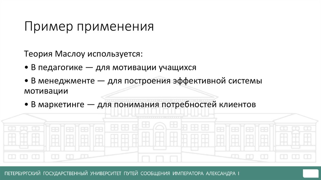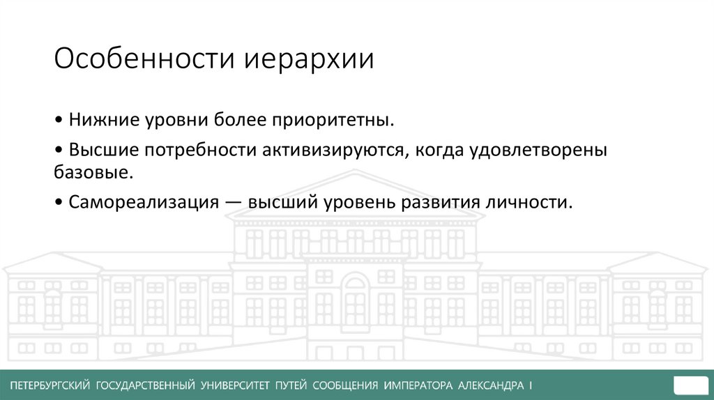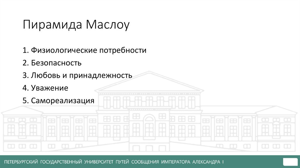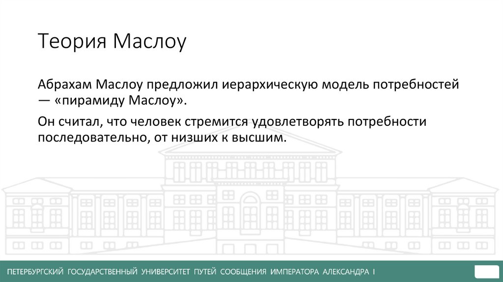 Теория МаслоуАбрахам Маслоу предложил иерархическую модель потребностей