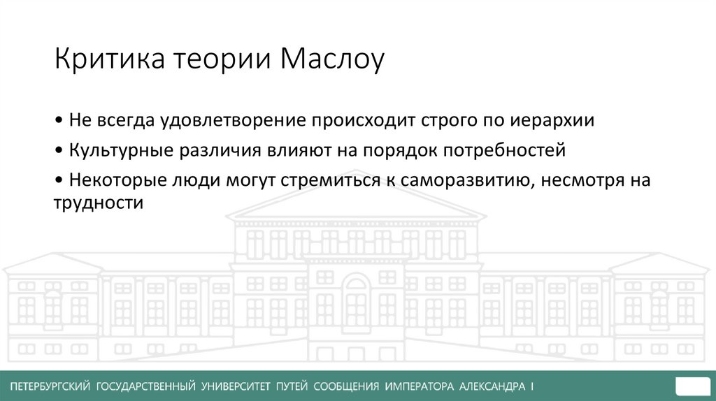 Критика теории Маслоу• Не всегда удовлетворение происходит строго по иерархии