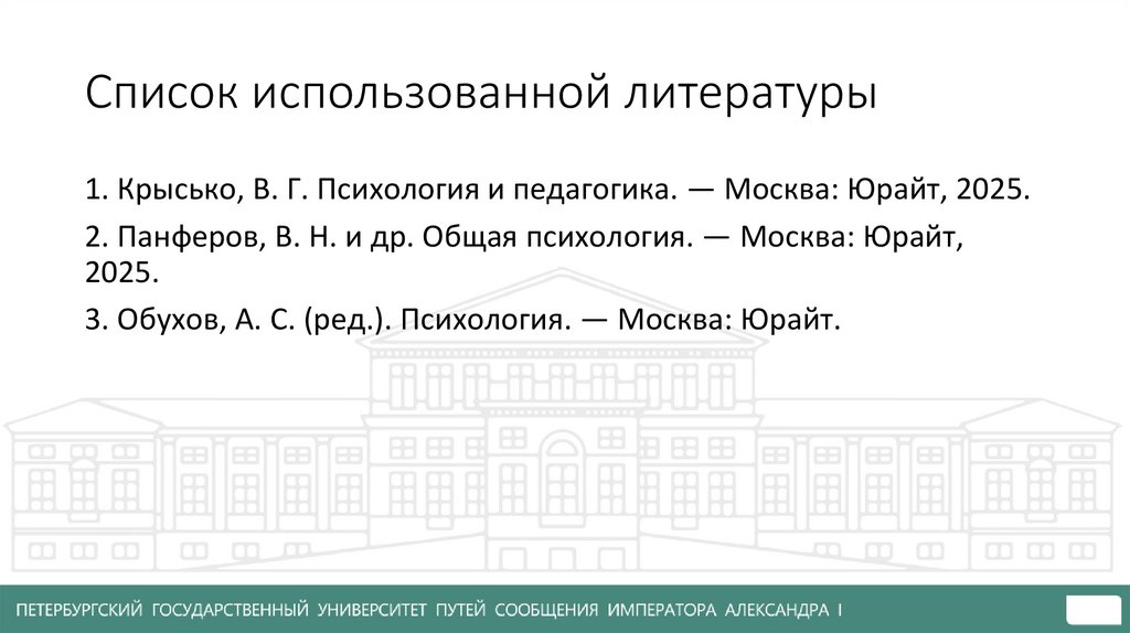 Список использованной литературы1. Крысько, В. Г. Психология и педагогика. — Москва: Юрайт, 2025.