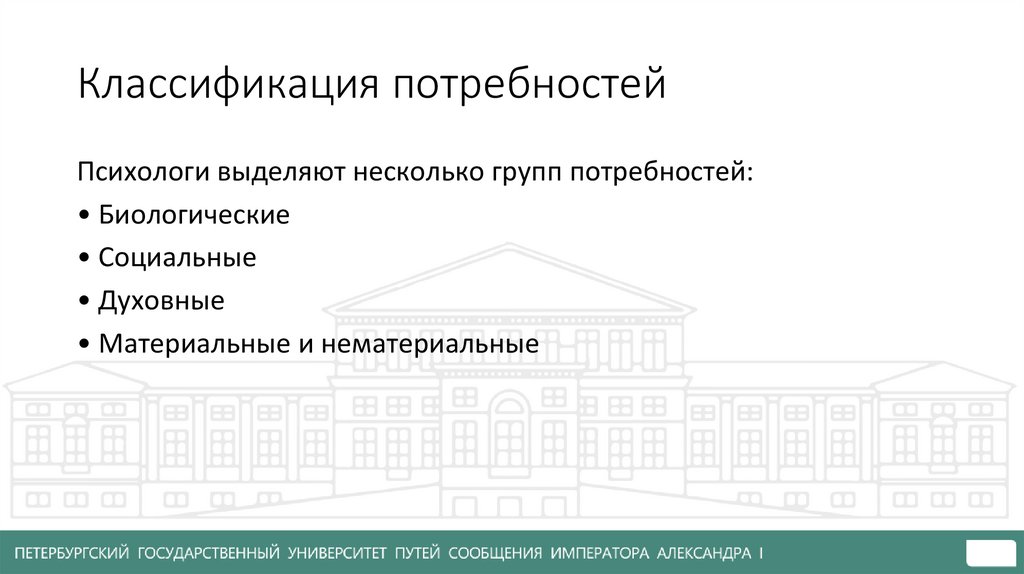 Классификация потребностейПсихологи выделяют несколько групп потребностей:
