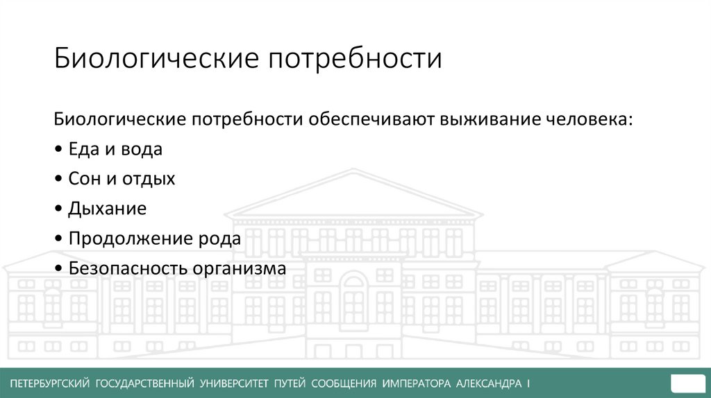 Биологические потребностиБиологические потребности обеспечивают выживание человека: