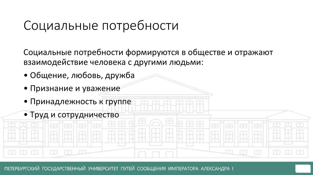Социальные потребностиСоциальные потребности формируются в обществе и отражают