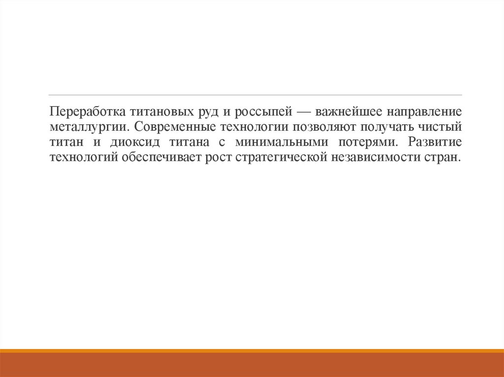 Переработка титановых руд и россыпей — важнейшее направлениеметаллургии. Современные технологии позволяют получать чистый
