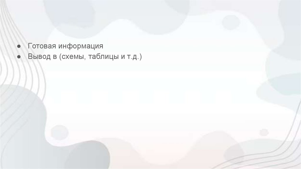 ● Готовая информация● Вывод в (схемы, таблицы и т.д.)