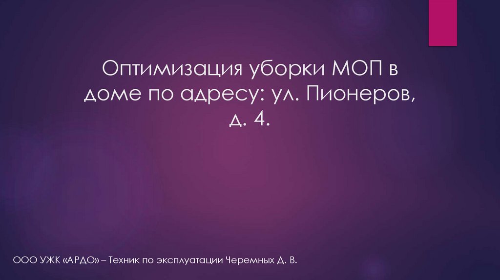 1. Оптимизация уборки МОП в доме по адресу: ул. Пионеров, д. 4.