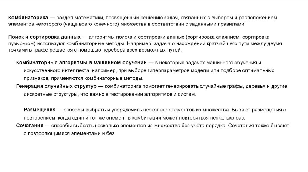 Комбинаторика — раздел математики, посвящённый решению задач, связанных с выбором и расположениемэлементов некоторого (чаще всего конечного) множества в соответствии с заданными правилами.