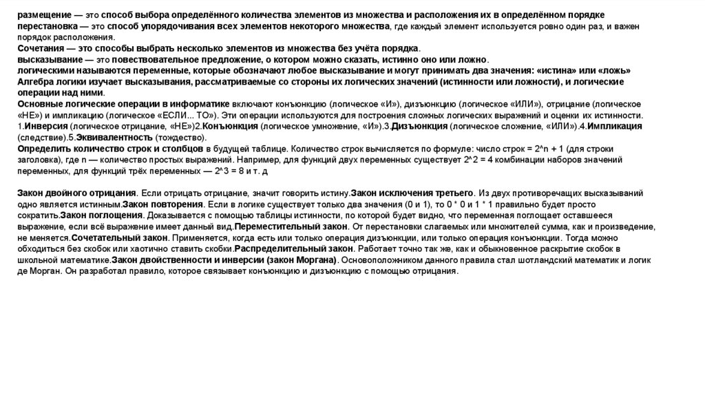 не меняется.Сочетательный закон. Применяется, когда есть или только операция дизъюнкции, или только операция конъюнкции. Тогда можно