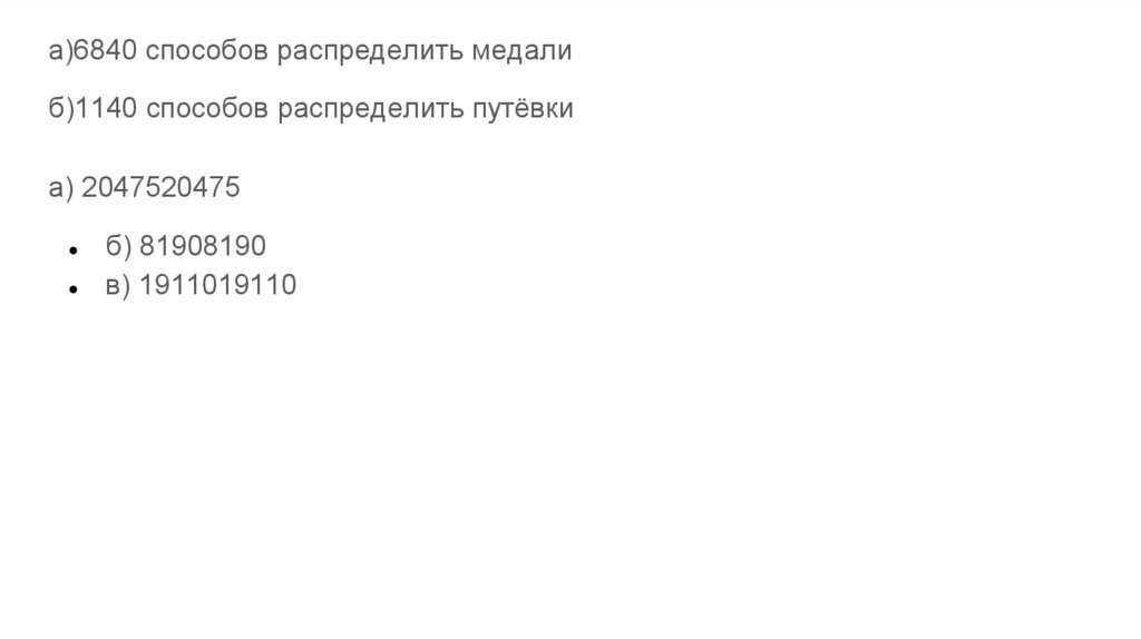 а)6840 способов распределить медалиб)1140 способов распределить путёвки