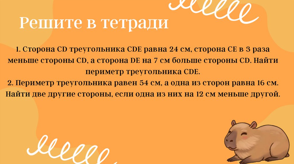 Решите в тетради1. Сторона CD треугольника CDE равна 24 см, сторона СЕ в 3 раза