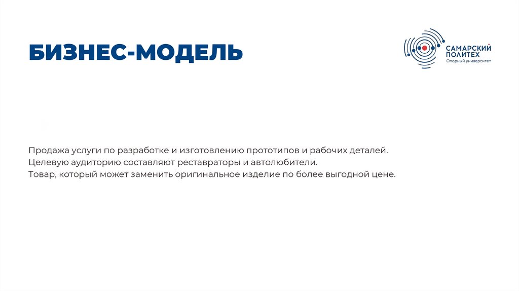 БИЗНЕС-МОДЕЛЬПродажа услуги по разработке и изготовлению прототипов и рабочих деталей.