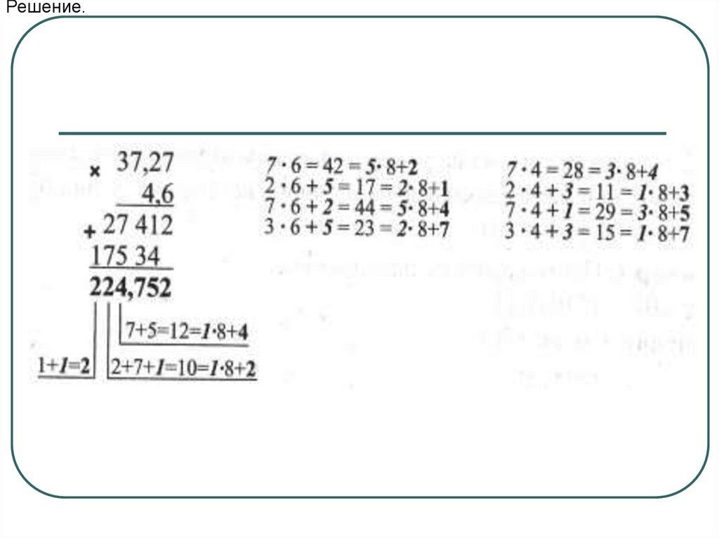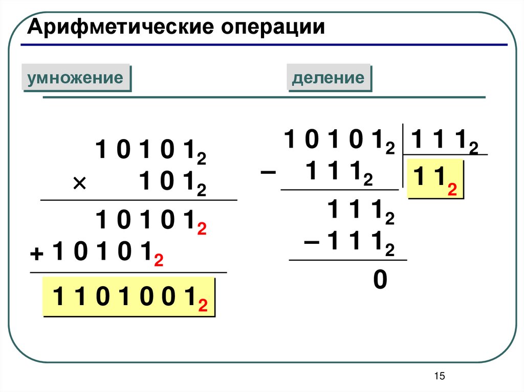 Операция умножения выполняется по алгоритму,подобному алгоритму выполнения операции