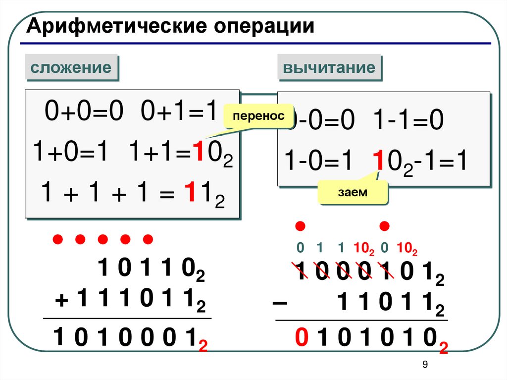 0+0=0 0+1=1 перенос0-0=0 1-1=0