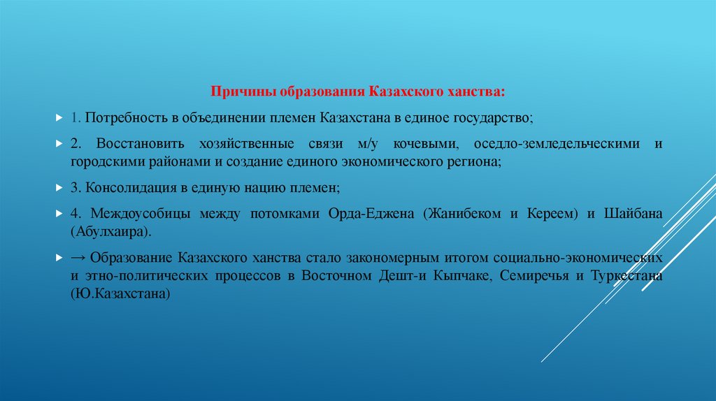 Причины образования Казахского ханства:1. Потребность в объединении племен Казахстана в единое государство;