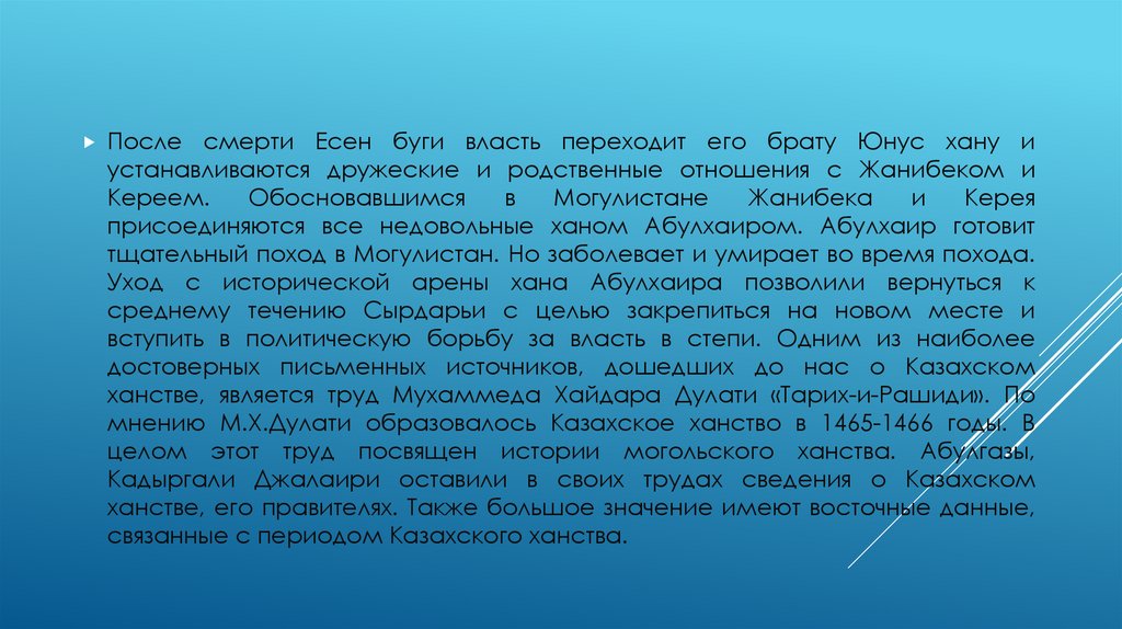 мнению М.Х.Дулати образовалось Казахское ханство в 1465-1466 годы. В