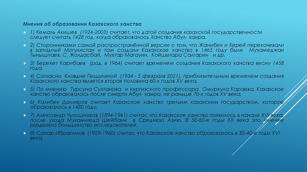 Мнения об образовании Казахского ханства1) Кемаль Акишев (1924-2003) считает, что датой создания казахской государственности