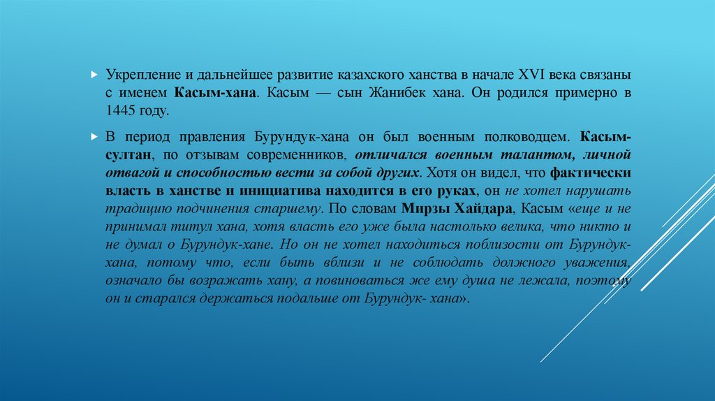 Укрепление и дальнейшее развитие казахского ханства в начале XVI века связаныс именем Касым-хана. Касым — сын Жанибек хана. Он родился примерно в
