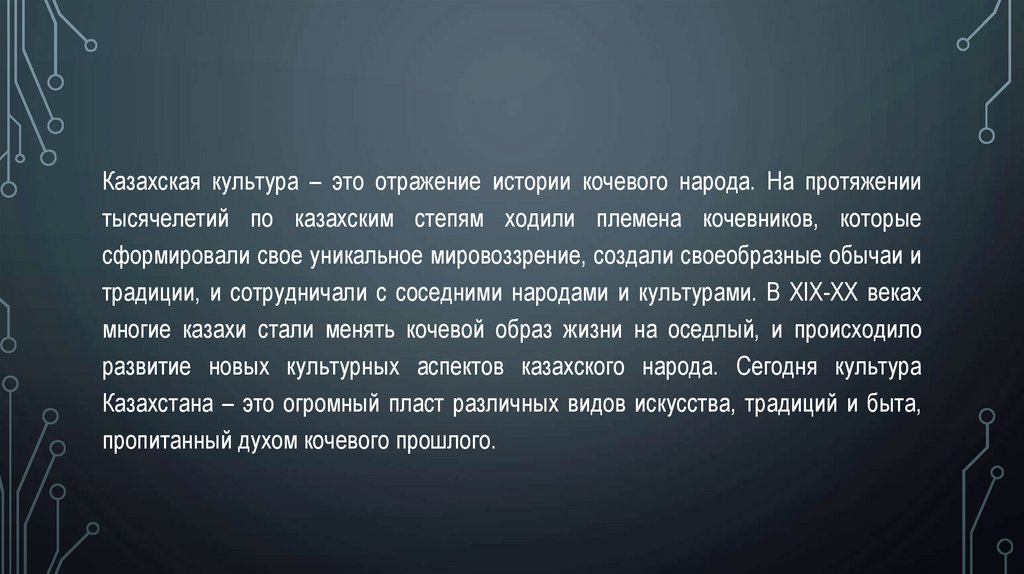 Казахская культура – это отражение истории кочевого народа. На протяжениитысячелетий по казахским степям ходили племена кочевников, которые