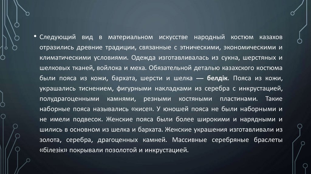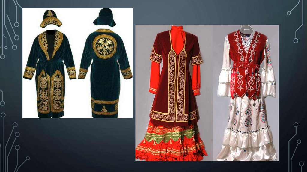 • Следующий вид в материальном искусстве народный костюм казаховотразились древние традиции, связанные с этническими, экономическими и