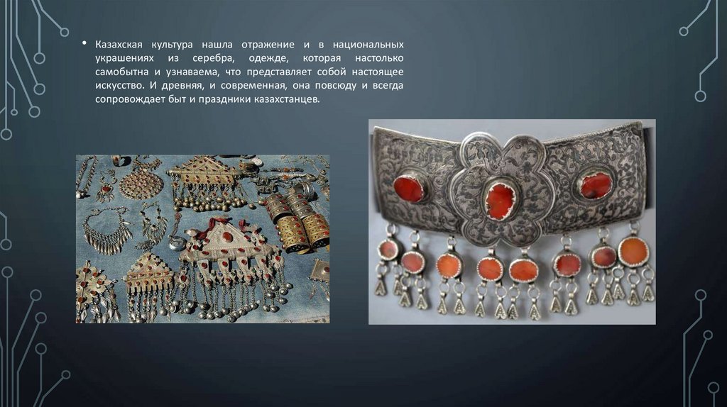 • Казахская культура нашла отражение и в национальныхукрашениях из серебра, одежде, которая настолько