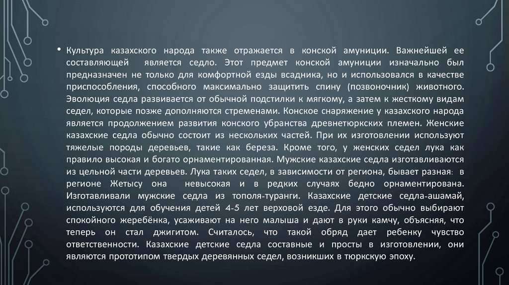 • Культура казахского народа также отражается в конской амуниции. Важнейшей еесоставляющей