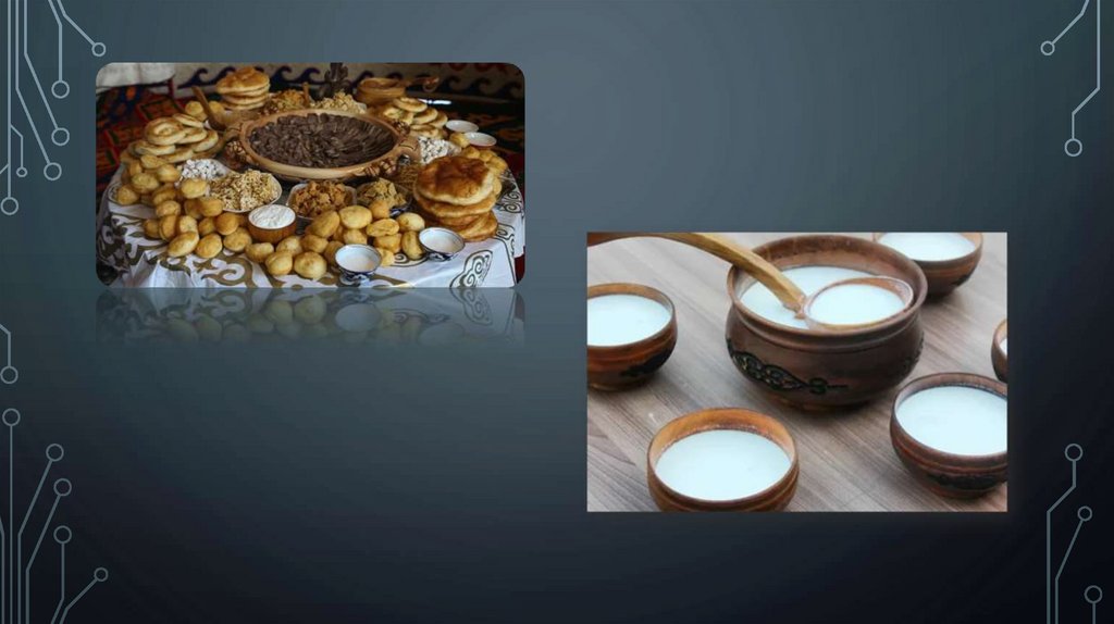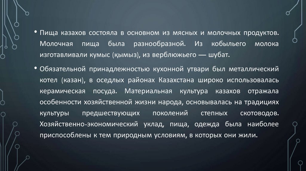 • Пища казахов состояла в основном из мясных и молочных продуктов.Молочная пища была разнообразной. Из кобыльего