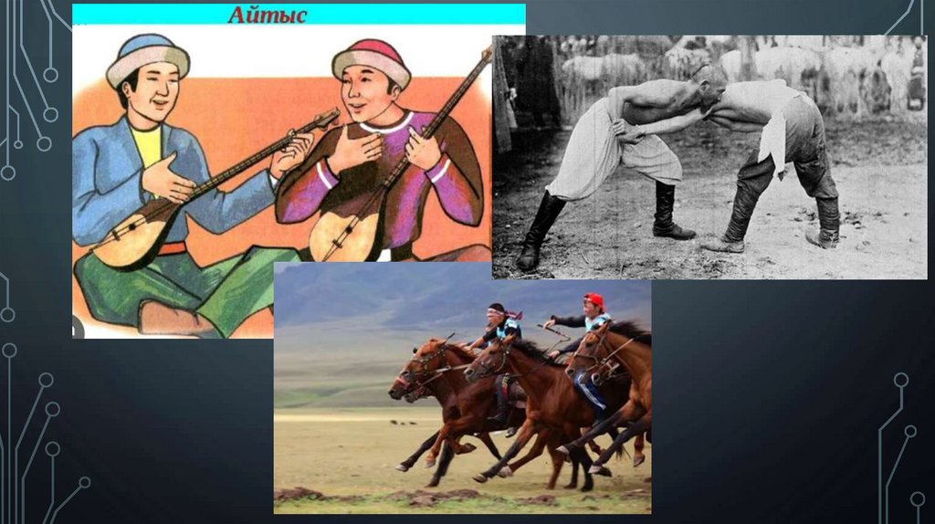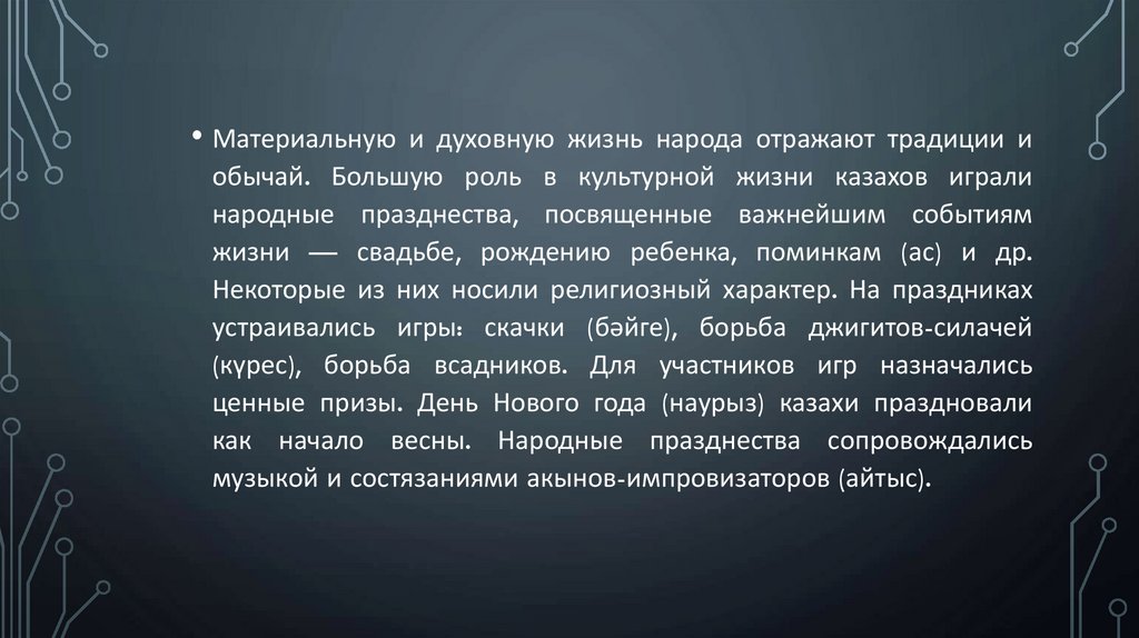• Материальную и духовную жизнь народа отражают традиции иобычай. Большую роль в культурной жизни казахов играли
