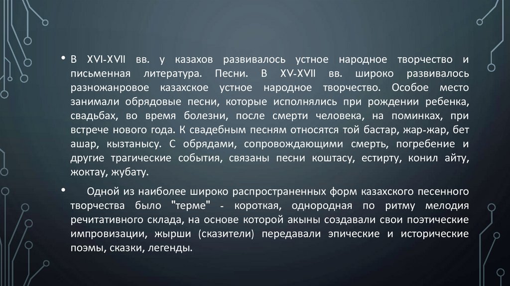 • В XVI-XVII вв. у казахов развивалось устное народное творчество иписьменная литература. Песни. В XV-XVII вв. широко развивалось