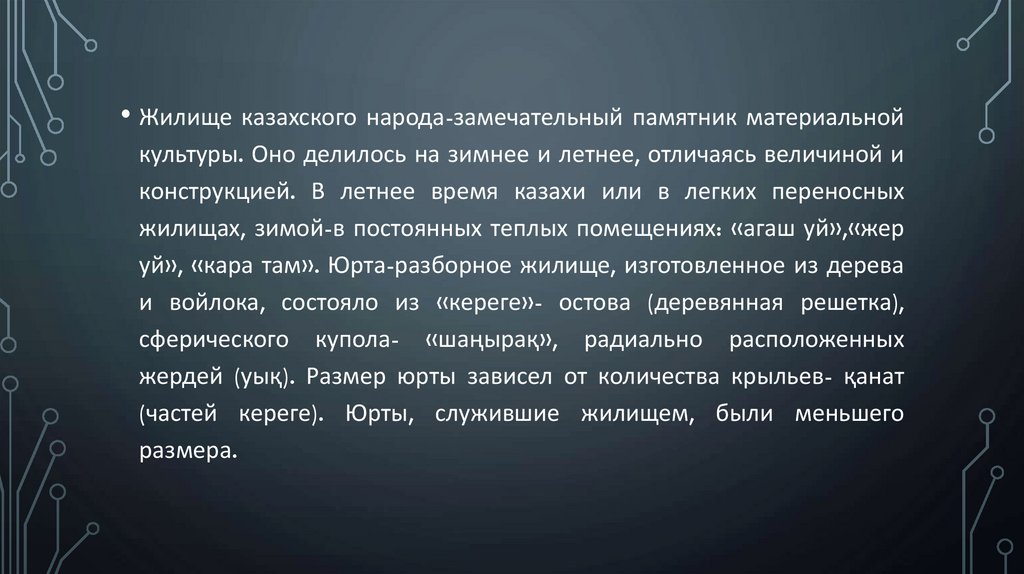 • Жилище казахского народа-замечательный памятник материальнойкультуры. Оно делилось на зимнее и летнее, отличаясь величиной и